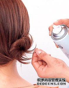 在發髻的發梢上噴發膠,并將發梢抓開造型