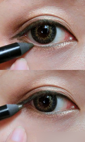 2、選擇棕色眼線筆從眼珠上方橫著延長線條,然后將整個睫毛根部的空隙填滿。從上眼線的眼尾往回勾勒下眼線,只要畫三分之一段就好。