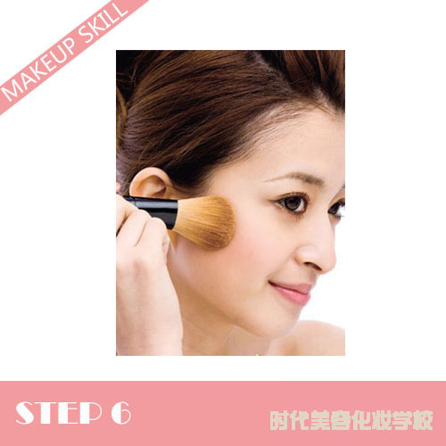 下面就是腮紅部分,我們這里選用的是桃紅色的腮紅,從顴骨往太陽(yáng)穴方向輕掃,兩三下即可。