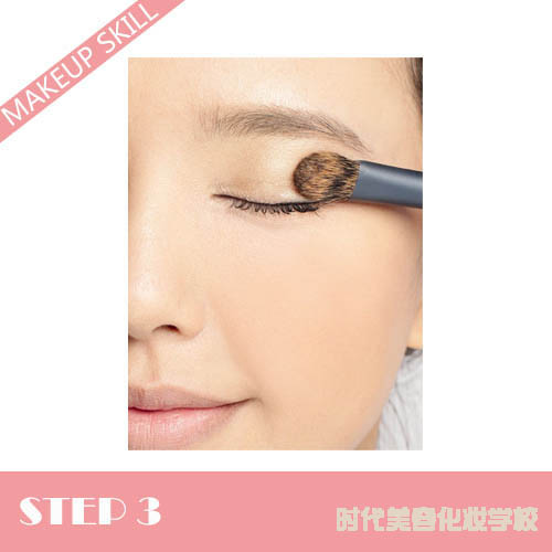 下面就是眼妝了,首先上眼瞼大面積涂抹米色眼影,營(yíng)造通透、自然的妝效。