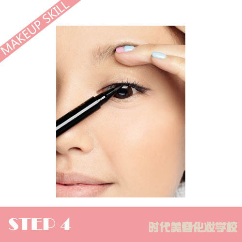 接著抬起上眼皮,用液體眼線筆填滿睫毛根部的空隙。