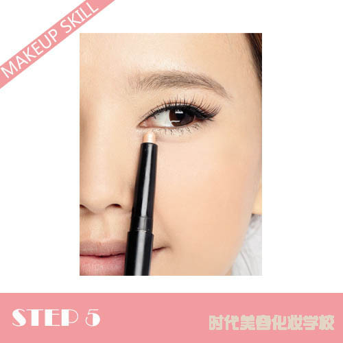 將珠光米色眼影涂抹在下眼瞼淚袋處,令表情楚楚可憐,這樣就完成了眼妝的部分。