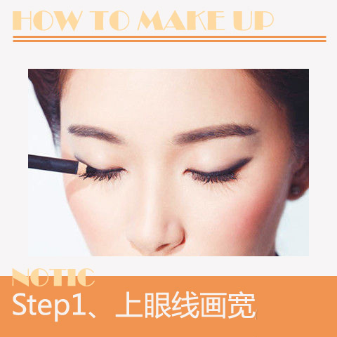 貼好假睫毛后,用眼線筆沿著上睫毛根部,將睫毛根部間的空隙填滿。然后從眼頭到眼尾畫出一條較粗的眼線。眼線的寬度以睜開眼后,與上眼皮褶皺重合為準。