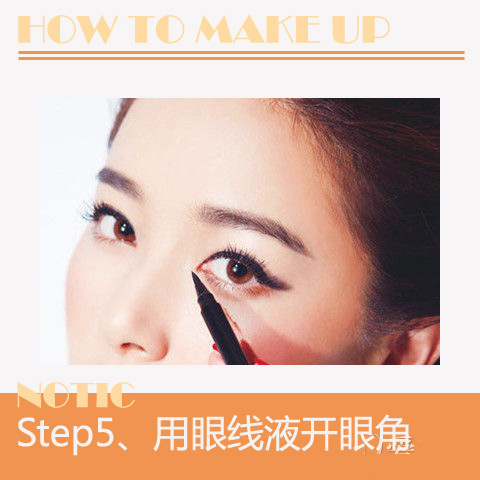 內雙的眼角多是倒勾狀,用碳黑色的眼線液將眼角處的眼線略微向前化出一點點并延至眼角下側,就好像開了眼角的效果。