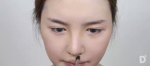 第七步打鼻影。用棕色的眼影棒涂在眉頭,然后用刷子向下掃開,一直刷到鼻頭,自然暈開。