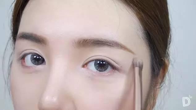 第九步涂眼影。首先用不帶珠光的乳白色眼影涂在整個上眼皮和眉骨處。