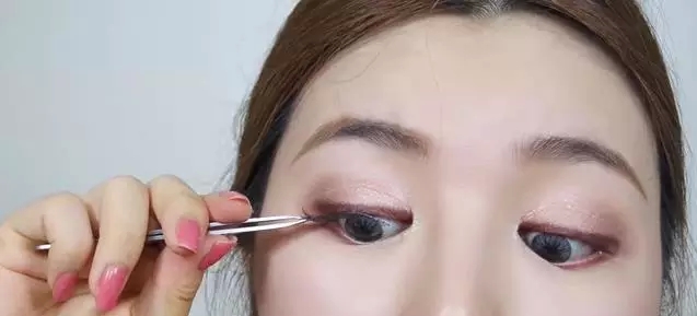 第十一步睫毛。先貼假睫毛,眼睛向下看把假睫毛貼在睫毛根部。順序是:眼中,眼尾,眼角。