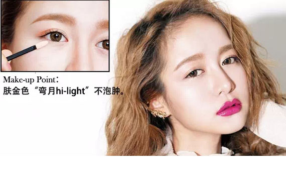現在分享的就是解套方法,換用貼近膚色的粉、金色珠光,就不怕突兀,將眼影點在眼頭上方的眼皮處,范圍不超過1/3。