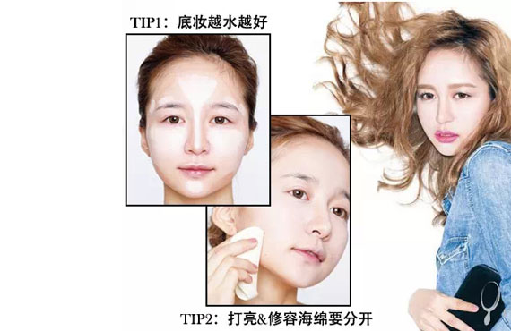 圖上的打亮處用比平常淺一號的粉底,深色區則用更深的粉底色號。