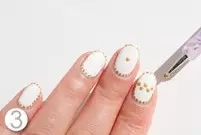 Step 2:用點(diǎn)鉆筆沾取金黃色珠光甲油,沿著指甲的周圍點(diǎn)上小波點(diǎn)。