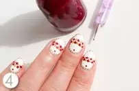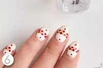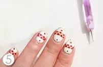 Step 4:然后用點(diǎn)鉆筆沾取紅色甲油點(diǎn)在金黃色波點(diǎn)的間隙,波點(diǎn)的大小與金黃色波點(diǎn)一致。在靠近指甲根部的位置點(diǎn)上紅色的波點(diǎn)。
