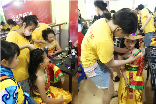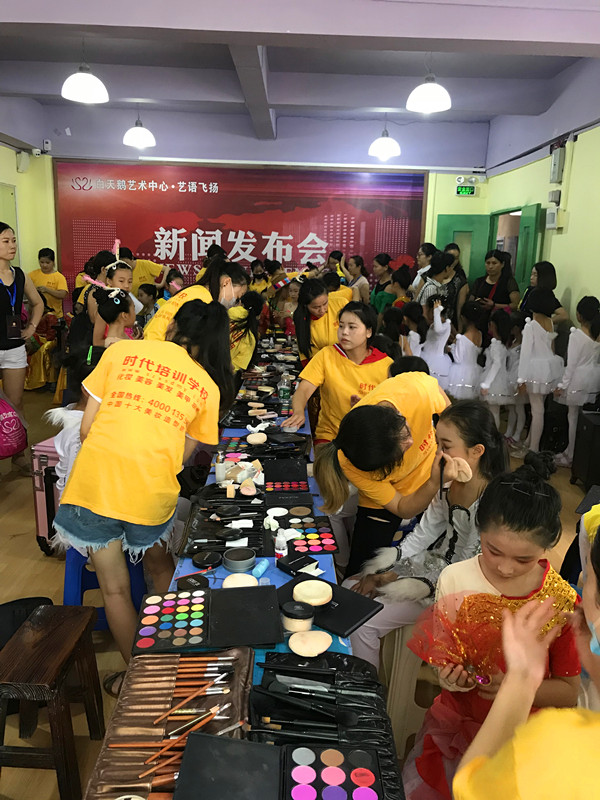 “白天鵝藝術中心——藝影飛揚”新聞發(fā)布會于2018年6月12日在深圳福永舉行,由時代國際化妝學校的學員為表演的小朋友們化妝造型。