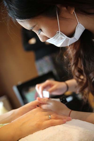 Wendy工作起來極為認(rèn)真,帶上口罩,打開工具箱,讓顧客選了家里比較舒服的位置開始做指甲。打磨,拋光,軟化,營養(yǎng),打底,上色。Wendy認(rèn)真地做著每一環(huán)節(jié)。