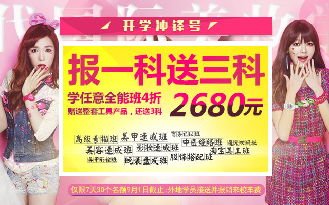 以下課程任選三科免費(fèi)學(xué)習(xí):高級(jí)素描班、晚裝盤發(fā)班、美甲速成班、商務(wù)禮儀班、中醫(yī)經(jīng)絡(luò)課程、吹風(fēng)造型課程、彩妝速成班、美容速成班、平面速成班、淘寶美工速成班、淘寶運(yùn)營(yíng)速成班。