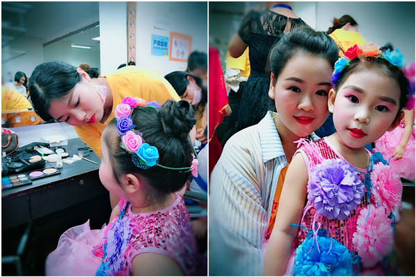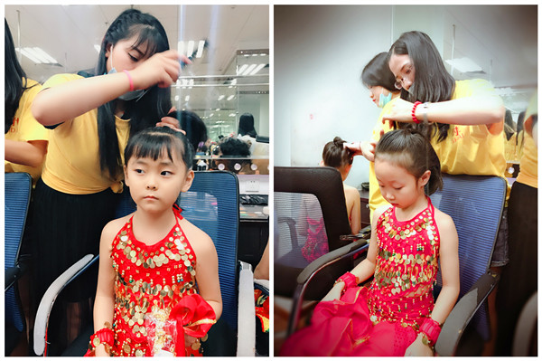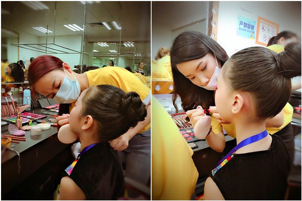 時代化妝班經歷多次國際重大賽事考驗,面對如潮水般的觀眾,眼里只有一件事,那就是完成讓自己的化妝技巧完整的展現,讓每一個參賽小朋友更有魅力。心態早已不會阻礙她們對技巧的追求,比如跟妝模特這一塊,時代化妝組學員采用當前更新跟妝法,依照小朋友的面部結構,結合黃金分割法則,為參演小朋友勾勒出更適合臉型的彩妝。